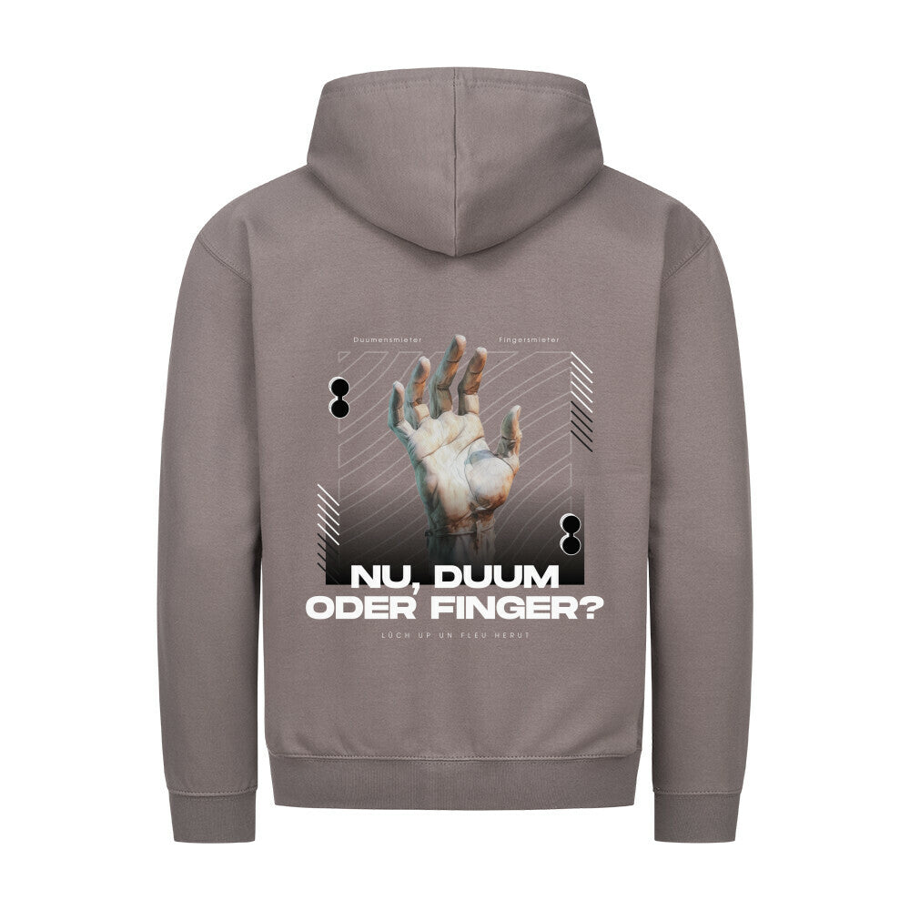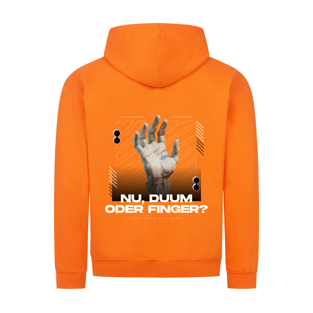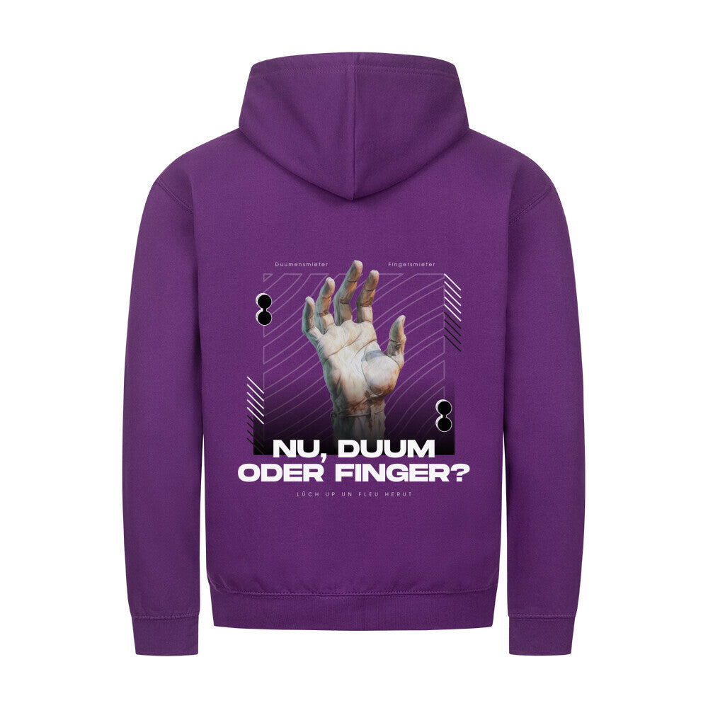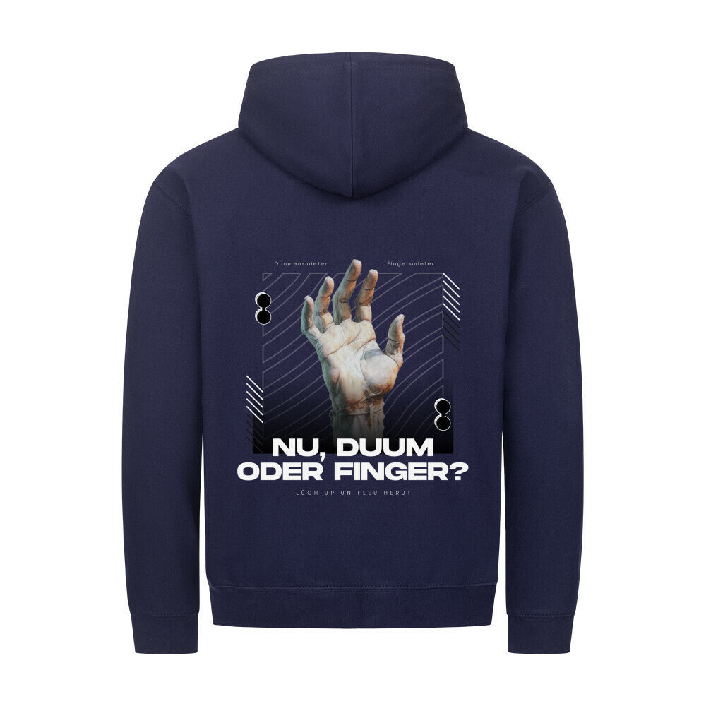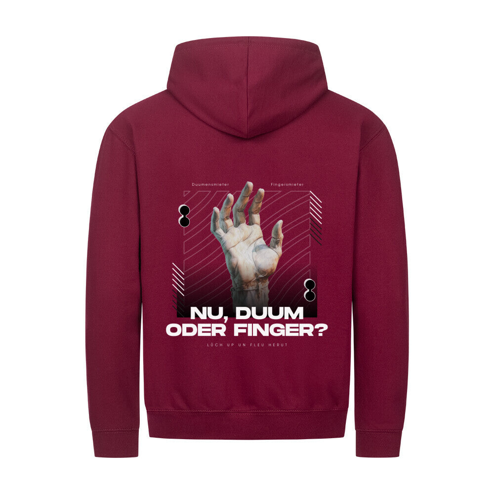 Das markante Design mit Handgrafik und dem plattdeutschen Spruch „Nu, Duum oder Finger?“ macht den Hoodie zum Hingucker auf jeder Straße und in jedem Vereinsheim. Der praktische Reißverschluss und die bequeme Passform sorgen dabei für angenehmen Tragekomfort.